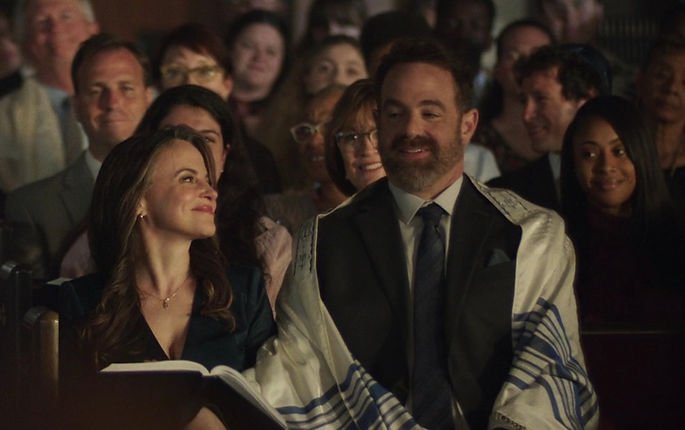 I did. I looked things up online. I didn’t read a full story, but I looked at different artwork of her to get inspiration about who she is. There’s one frame in a comic where Billy comes home and introduces his parents to his boyfriend. Rebecca grabs him in a bear hug, saying, ‘We’re so happy for you and happy to meet you.’ That frame was really helpful to me and probably the most inspiring because you could tell from it that she was giving all of herself to her son, and she was so full of love. I liked the combination in that particular artist’s depiction of her with those strict rectangular glasses, which gave her a formal appearance. I think Daniel [Selon] also reflected that in the dress he chose for me first, at the bar mitzvah, but toward her son, she’s really effusive.